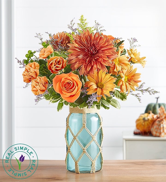 EXCLUSIVE There’s an undeniable elegance to our new autumn arrangement. Designed exclusively in partnership with Real Simple, it brings seasonal bronze mums together with warm orange blooms and a hint of purple. Arranged in our sea green jar, with a handmade macramé cover, this signature fall beauty gets some added Boho style.
